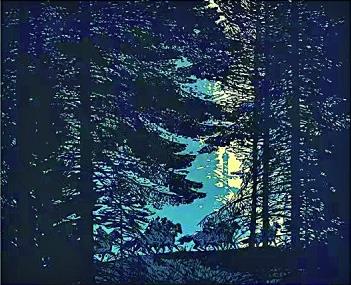 面對彼時套色木刻創(chuàng)作存在的這一問題,晁楣通過不懈研究與探索找到了解決的方法。他放棄了過去以黑線勾勒輪廓再以彩色填充的方式,大膽采用色塊拼接的新方法,將黑色與彩色并置在畫面中,使黑色輪廓線融入暗部,統(tǒng)一為一個個整體色塊。晁楣強調(diào),套色木刻中不能沒有黑色,因為它在畫面中發(fā)揮著重要的作用。這種“剪影式”的構圖大量削減了輪廓線在畫面中的應用,帶來強烈的色彩對比以及極具視覺張力的疏密關系,使得畫面結構主次分明,保持了作品的整體感。試看晁楣的套色木刻作品《北陲屏障》,逆光的環(huán)境中,頂天立地、枝繁葉茂的松樹剪影占據(jù)了畫面的大部分空間,在遠處光源的照耀下,一隊騎乘戰(zhàn)馬的巡邏兵疾馳而過,形成了動靜交織的畫面節(jié)奏。作品用為數(shù)不多的色彩營造光感,套色簡潔自然,茂密枝干交織形成的無數(shù)小色塊,展現(xiàn)出藝術家精湛的運刀技藝。
