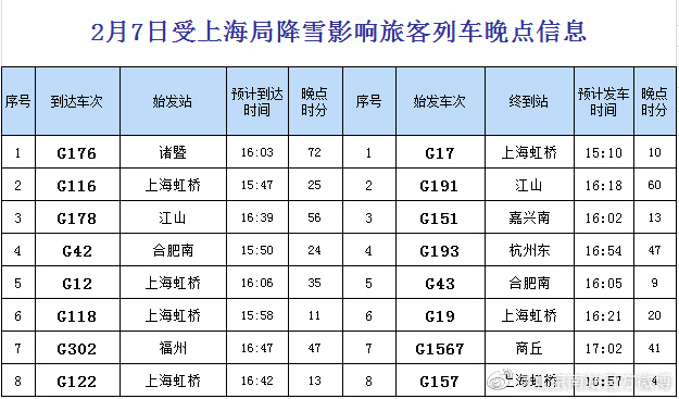 據(jù)@北京南站官方微博消息,受上海局降雪影響,北京南站京滬高鐵部分到達(dá)、始發(fā)列車(chē)有不同程度晚點(diǎn)。截至目前,具體晚點(diǎn)情況信息如下,請(qǐng)廣大旅客及時(shí)關(guān)注12306官方信息和車(chē)站公告。