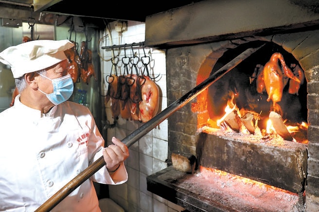 脫下便裝,穿上工作服,手拿烤鴨桿的張立群烤起鴨子來駕輕就熟。翻個(gè)、挪移、轉(zhuǎn)圈,爐火中,鴨坯逐漸由白色變成棗紅,滲出的油泛著亮光,香味透了出來。已是飯點(diǎn),等候的食客不時(shí)向操作間望去,只待烤鴨上桌,便可大快朵頤。
