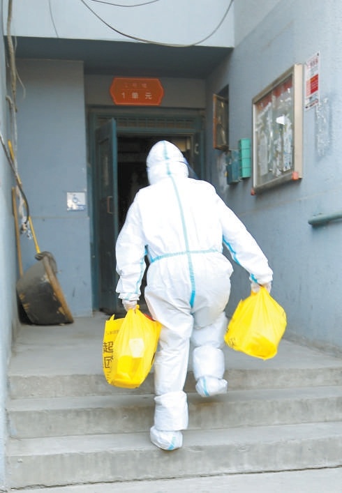 在酒仙橋街道封控小區(qū),一名防疫工作人員正在為居民配送物資。