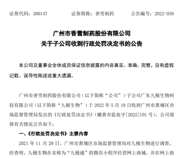 對此,香雪制藥表示,已要求九極生物主動(dòng)調(diào)整生產(chǎn)計(jì)劃,更改下架相關(guān)廣告;對相關(guān)責(zé)任人員進(jìn)行處罰;組織工作人員對相關(guān)法律法規(guī)進(jìn)行學(xué)習(xí),完善內(nèi)部管理制度與操作規(guī)程,嚴(yán)格按照規(guī)定對產(chǎn)品宣傳進(jìn)行規(guī)范管理。截至本公告披露日前,相關(guān)整改已完成。