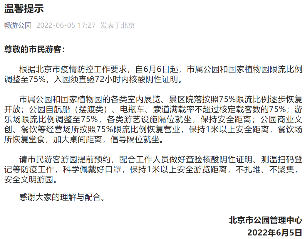 自6月6日起,北京市屬公園和國家植物園限流比例調(diào)整至75%