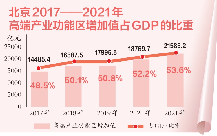 重點功能區(qū)呈現(xiàn)集聚效應。中關村國家自主創(chuàng)新示范區(qū)等高端產(chǎn)業(yè)功能區(qū)占據(jù)全市經(jīng)濟總量的半壁江山,2021年實現(xiàn)增加值2.2萬億元,占全市GDP的53.6%,比2016年提高5.3個百分點。
