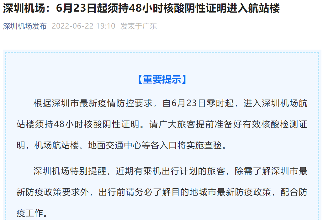 深圳機(jī)場(chǎng):6月23日起須持48小時(shí)核酸陰性證明進(jìn)入航站樓