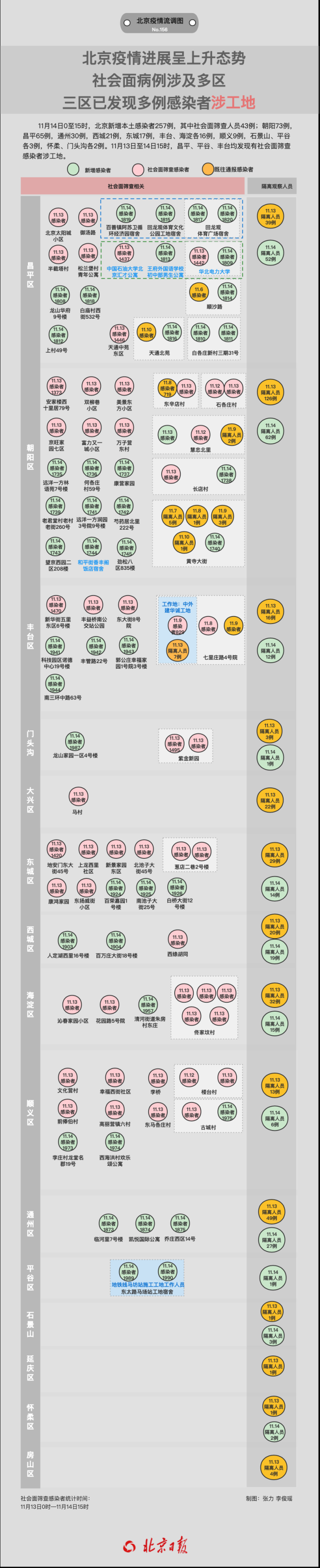 值得注意的是,11月13日至14日15時(shí),已有豐臺(tái)、昌平、平谷三區(qū)報(bào)告感染者涉工地。其中
