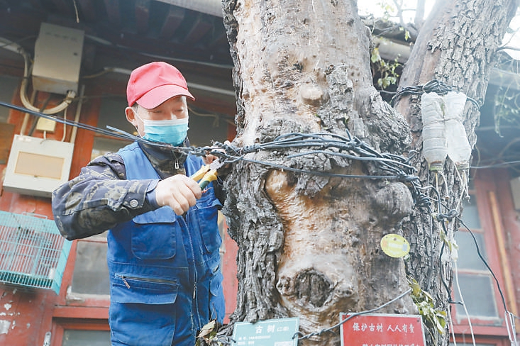 日前,在園林綠化部門、社區(qū)居委會工作人員的陪同下,東四街道綜合行政執(zhí)法隊來到東四六條某平房院。在院落南側(cè)房屋過道處,一棵樹齡約110年、掛著二級保護標牌的棗樹特別扎眼。古樹虬曲蒼勁,樹皮斑駁,在樹杈處,數(shù)根電線、鐵絲緊緊纏繞著樹干,由于年代久遠,部分鐵絲已深深嵌進了樹皮。居民利用古樹掛衣服、掛盆栽,還在樹身上釘了釘子。古樹根部周圍地面覆蓋了一層厚厚的水泥和瀝青,堆放著廢舊紙箱和花盆等雜物。工作人員立即找來工具,將樹身上的電線、鐵絲、釘子一一清除,清理了堆放在樹根處的雜物,并對樹根部的土壤進行疏松,使古樹得以“脫困”。