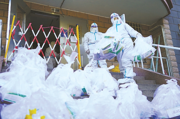 近日,朝陽(yáng)區(qū)東湖街道利澤西園一區(qū)社區(qū)“大白”逐戶為封控居民送抗原試劑盒,分發(fā)蔬菜包等生活必需品。 本報(bào)記者 程功攝