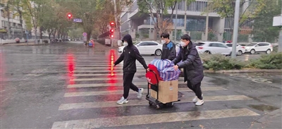 學(xué)校進(jìn)入臨時(shí)管控狀態(tài),但很多學(xué)生人在住宿區(qū)、學(xué)習(xí)物品在北校園的學(xué)習(xí)區(qū),怎么辦?該校通過接訴即辦平臺收到學(xué)生的反映后,立即作出決策,成立物品傳遞轉(zhuǎn)運(yùn)隊(duì)伍,幫助學(xué)生解決人與學(xué)習(xí)物品分離的問題,學(xué)院書記、院長和師生志愿者立即行動(dòng)起來組建搬運(yùn)隊(duì)伍,有的在校內(nèi)幫忙打包學(xué)生物資,有的在校外接應(yīng)、及時(shí)將學(xué)生所需物資送到學(xué)生手里。