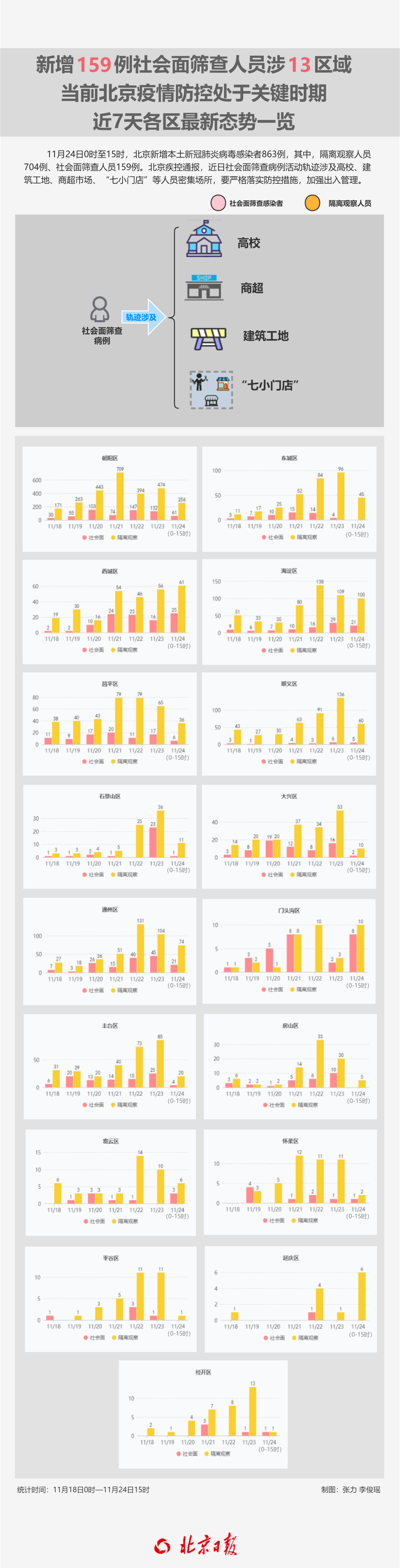 11月24日0時(shí)至15時(shí),北京新增本土新冠肺炎病毒感染者863例,其中,隔離觀察人員704例、社會(huì)面篩查人員159例;朝陽區(qū)317例,海淀區(qū)121例,通州區(qū)95例,西城區(qū)86例,順義區(qū)65例,東城區(qū)45例,昌平區(qū)42例,豐臺(tái)區(qū)24例,門頭溝區(qū)18例,石景山區(qū)、大興區(qū)各12例,密云區(qū)9例,延慶區(qū)6例,房山區(qū)5例,懷柔區(qū)3例,經(jīng)開區(qū)2例,平谷區(qū)1例;重型3例、普通型2例、輕型164例、無癥狀感染者694例。