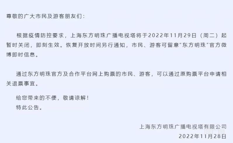 上海東方明珠廣播電視塔有限公司28日晚發(fā)布公告稱,根據疫情防控要求,上海東方明珠廣播電視塔于2022年11月29日起暫時關閉,即刻生效。恢復開放時間另行通知,市民、游客可留意“東方明珠”官方微博即時信息。