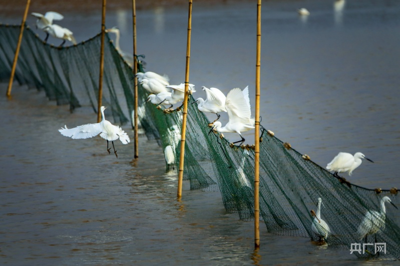 央廣網(wǎng)都昌12月13日消息(記者鄧玉玲)時(shí)值冬日,在江西鄱陽湖都昌磯山湖濕地,仍然活躍著近千只夏候鳥白鷺,它們追逐在湖畔淺灘,守候在隔離網(wǎng)周邊,捕食著可口的小魚小蝦,享受著候鳥家園的歡樂。