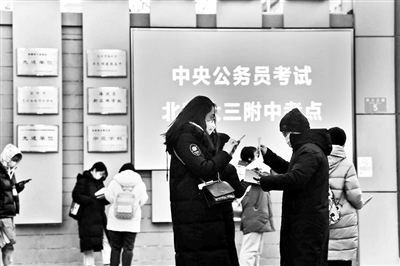 昨日早上8點,北京師范大學第三附屬中學的考點已有考生陸續(xù)到場。一些公考輔導機構在考點門前派發(fā)復習資料,北京青年報記者看到,黨的二十大報告,北京冬奧會、冬殘奧會,2022年中央一號文件等時事熱點都被列為重點內容。8點20分,考生開始入場。工作人員手持測溫儀,對每個考生進行測溫。考點內的一樓也設置了兩個備用考場。據(jù)悉,按照要求,有發(fā)熱(體溫≥37.3℃)等可疑癥狀的,應服從安排在備用考場佩戴N95口罩參加考試。