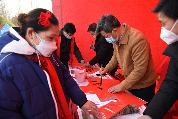 臺(tái)上歡歌載舞,臺(tái)下人頭攢動(dòng)。配鑰匙、法律援助咨詢、醫(yī)生義診、眼鏡修理等服務(wù),吸引了不少村民。書法家們現(xiàn)場(chǎng)書寫幾百幅福字,將新年的美好祝愿贈(zèng)予村民。