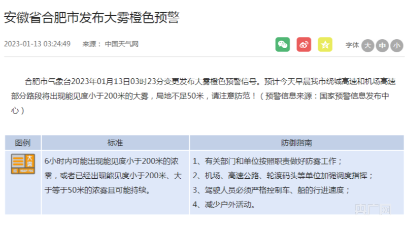 央廣網(wǎng)合肥1月13日消息(記者鮑玉嬋)記者從安徽省氣象局獲悉,合肥市氣象臺2023年01月13日03時23分變更發(fā)布大霧橙色預警信號。預計今天早晨我市繞城高速和機場高速部分路段將出現(xiàn)能見度小于200米的大霧,局地不足50米,請注意防范!