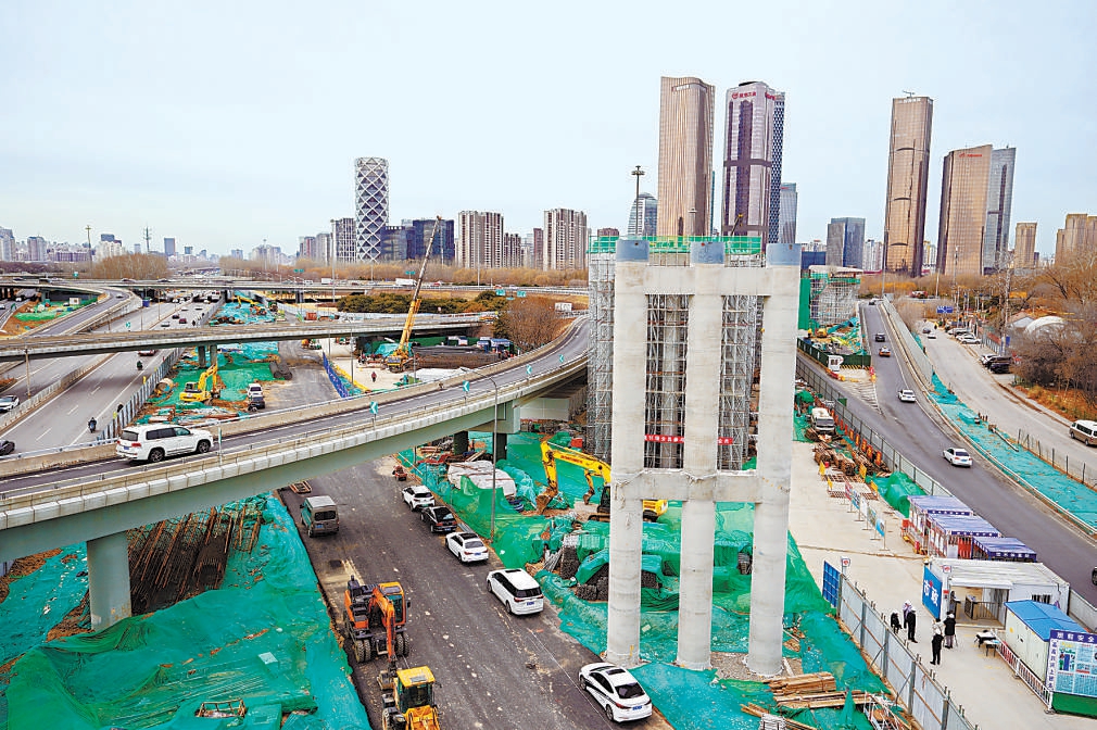 京密快速路4標段所在的五元橋施工現場,工人們忙著綁扎鋼筋、澆筑混凝土、焊接鋼筋籠。目前,該項目正處于橋梁樁基建設、現澆箱梁、排架搭設等施工階段。 本報記者 程功攝