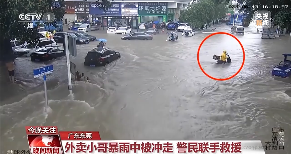 廣東東莞:外賣小哥暴雨中被沖走 警民聯(lián)手救援