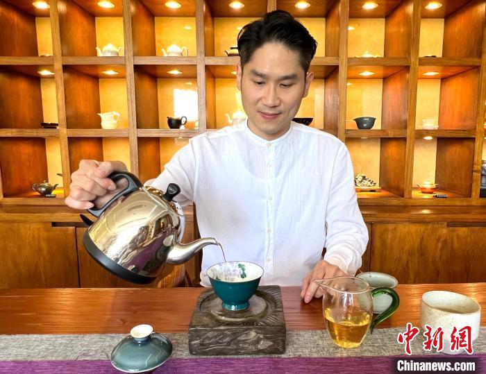 2023年6月,臺灣茶葉世家的后人張洪瑋接受中新社記者采訪?!≈行律缬浾?朱曉穎 攝