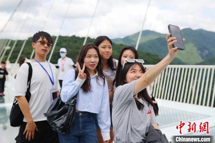 7月3日至8日,2023年全國(guó)臺(tái)聯(lián)第二十屆臺(tái)胞青年千人夏令營(yíng)湖南分營(yíng)舉行。圖為臺(tái)胞青年“打卡”張家界玻璃橋。 鄭和澤 攝