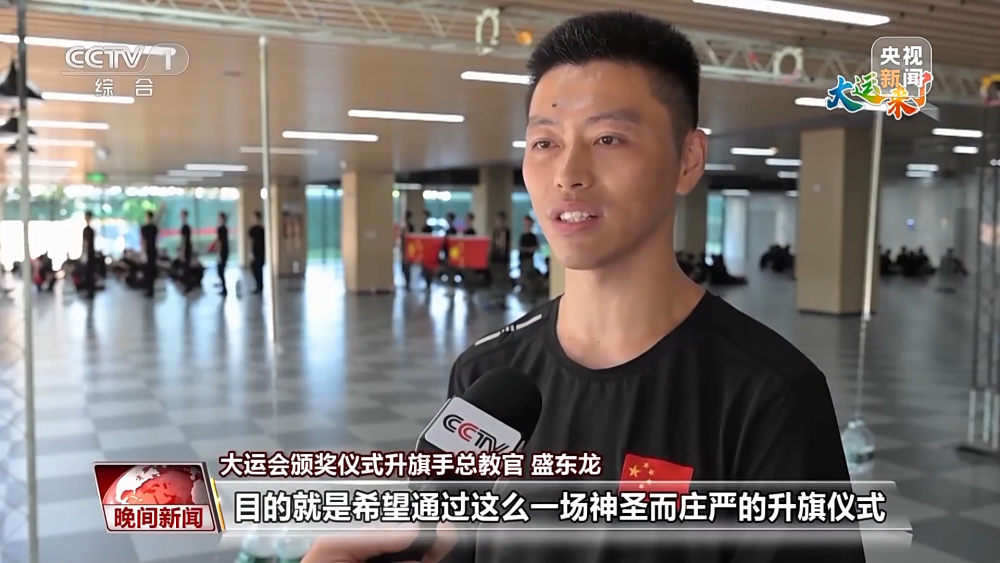 大運(yùn)會(huì)頒獎(jiǎng)儀式升旗手總教官 盛東龍:目的就是希望通過(guò)一場(chǎng)神圣而莊嚴(yán)的升旗儀式來(lái)感染他們,來(lái)激發(fā)和增強(qiáng)他們的愛(ài)國(guó)情懷和使命擔(dān)當(dāng)。