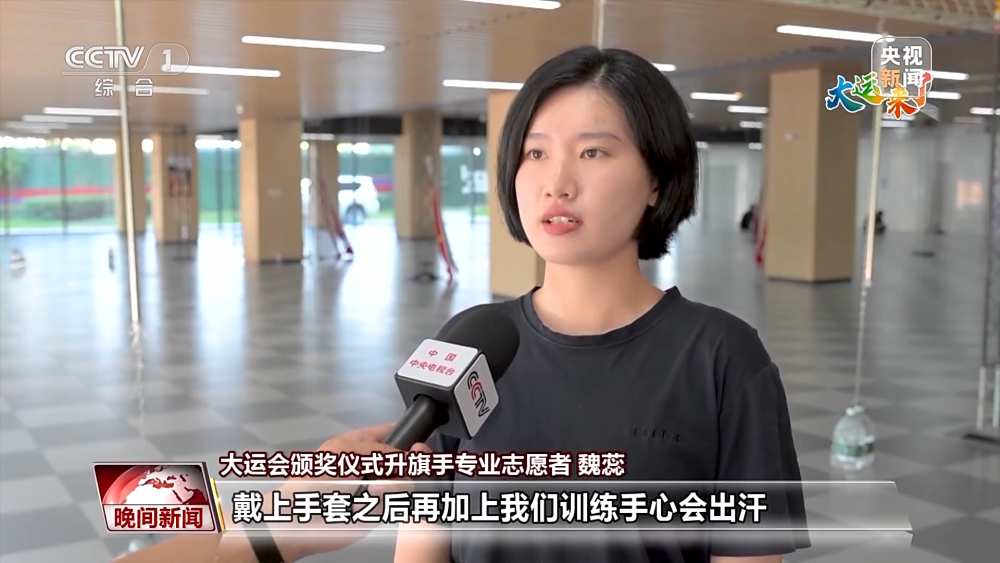 大運(yùn)會(huì)頒獎(jiǎng)儀式升旗手專(zhuān)業(yè)志愿者 魏蕊:我們面對(duì)的是國(guó)旗。當(dāng)運(yùn)動(dòng)員在運(yùn)動(dòng)場(chǎng)上贏得屬于自己國(guó)家榮譽(yù)的時(shí)候,我們的工作就是幫他們?cè)忈尯脤儆谒麄冏约旱囊环輼s譽(yù)。