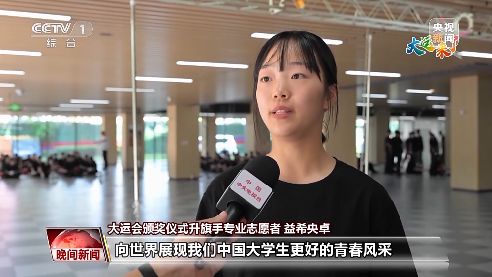 大運(yùn)會(huì)頒獎(jiǎng)儀式升旗手專(zhuān)業(yè)志愿者 益希央卓:要心里有信念才能把這件事做好。向世界展現(xiàn)我們中國(guó)大學(xué)生更好的青春風(fēng)采。