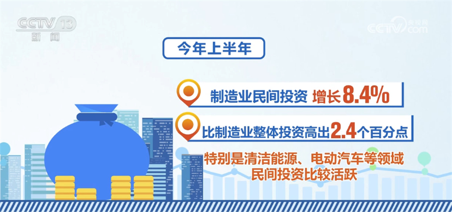 國家發(fā)展改革委相關負責人表示,當前,民間投資結構持續(xù)優(yōu)化,一些領域民間投資顯現(xiàn)了不少亮點。今年上半年,除房地產(chǎn)開發(fā)以外的民間投資同比增長9.4%,增速比全部投資高5.6個百分點;制造業(yè)民間投資增長8.4%,比制造業(yè)整體投資高出2.4個百分點,特別是清潔能源、電動汽車等領域民間投資比較活躍;基礎設施民間投資增長15.6%,比基礎設施整體投資高出8.4個百分點,呈現(xiàn)出較強的投資信心和投資動力。