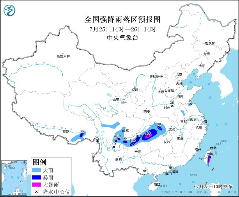 預(yù)計(jì),7月25日14時(shí)至26日14時(shí),西藏東南部、云南西部和東北部、四川西部和南部、貴州北部、重慶東部、湖北西南部、湖南西北部以及臺(tái)灣島東部等地有大到暴雨,其中,貴州西北部、重慶東南部、湖南西北部和臺(tái)灣島東部等地的部分地區(qū)有大暴雨(100~200毫米);上述部分地區(qū)伴有短時(shí)強(qiáng)降水(最大小時(shí)降雨量20~50毫米,局地可超過80毫米),局地有雷暴大風(fēng)等強(qiáng)對(duì)流天氣。