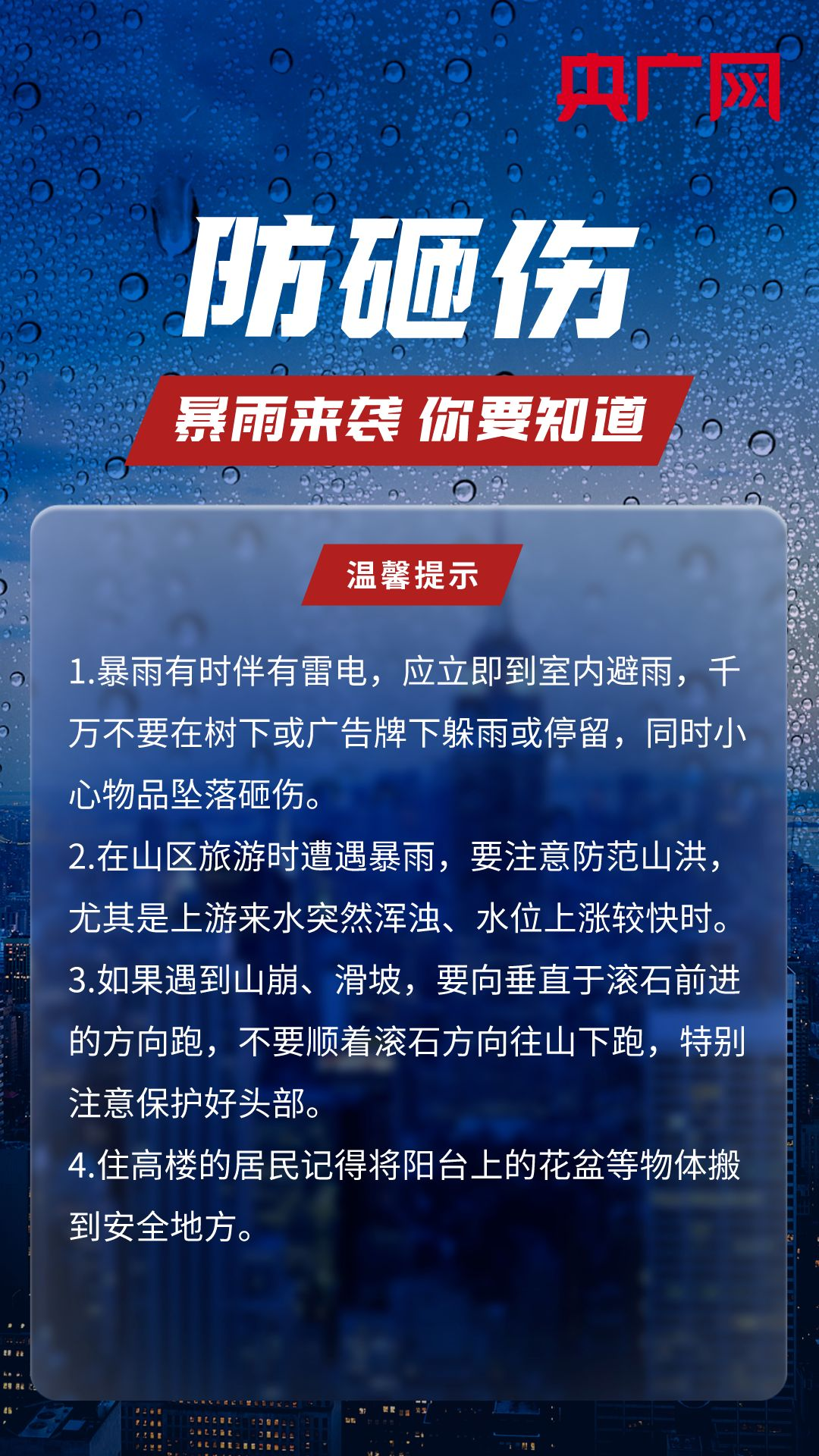 央廣網北京8月1日消息 近日,多地連降暴雨,雨情牽動著人們的心。暴雨來臨前,我們能提前做哪些準備工作?暴雨天不得不外出時,又該如何做好防范?戳圖了解↓↓