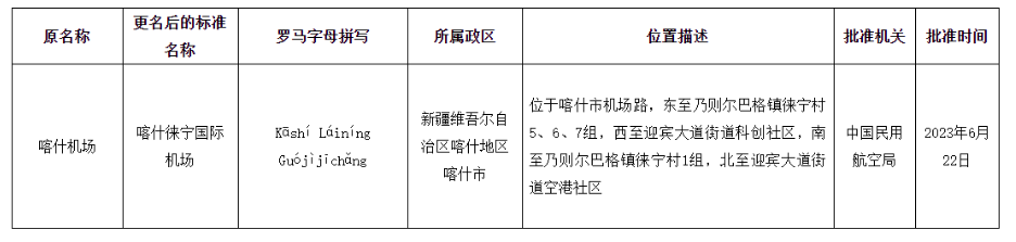 據(jù)民政部發(fā)布公告,經(jīng)中國民用航空局批準(zhǔn),喀什機(jī)場(chǎng)更名為喀什徠寧國際機(jī)場(chǎng)。