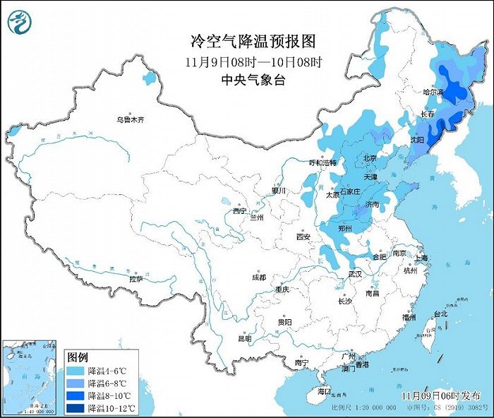 受冷空氣影響,9-13日,中東部地區(qū)將自北向南先后出現(xiàn)大風(fēng)降溫天氣,大部地區(qū)過程累計降溫幅度有6~10℃,黑龍江東部、吉林東部以河南、湖北、湖南、貴州和廣西等地的部分地區(qū)降溫可達(dá)12℃以上;南方地區(qū)強(qiáng)降溫主要出現(xiàn)在10-13日;13日前后最低氣溫0℃線位于山東中南部-河南北部一線,江淮地區(qū)最低氣溫5℃左右。