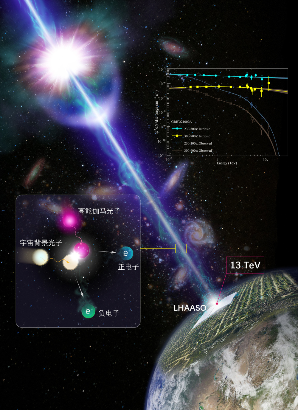 高能伽馬光子在飛行時會被宇宙中彌漫的背景光吸收,伽馬光子能量越高,被吸收得越強烈。反過來,根據(jù)伽馬射線被吸收的程度,也可以研究宇宙背景光的強度與性質。GRB 221009A的極高亮度使我們有機會探測到來自24億光年外宇宙深處所產(chǎn)生的高能伽馬光子,這一結果將促使人們重新考慮宇宙中星系的形成和演化過程。