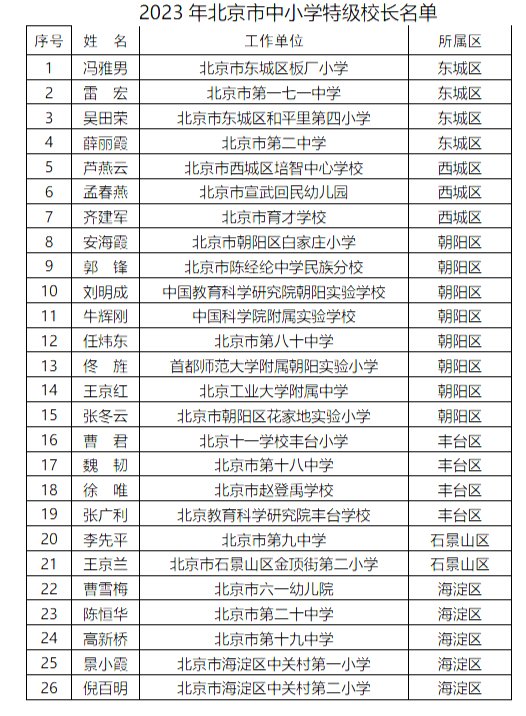 央廣網(wǎng)北京11月30日消息(記者 馮儀) 近日,北京市教育委員會(huì)公布北京市第三批中小學(xué)特級(jí)校長(zhǎng)名單,共44人入選。