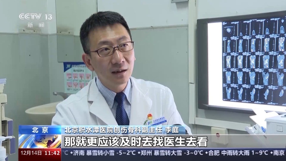 北京積水潭醫(yī)院創(chuàng)傷骨科副主任 李庭:下雪之后往往是以滑倒摔傷這種造成的損傷為主,我們第一位的就是橈骨遠(yuǎn)端骨折,需要打石膏的,就已經(jīng)錯(cuò)位了。