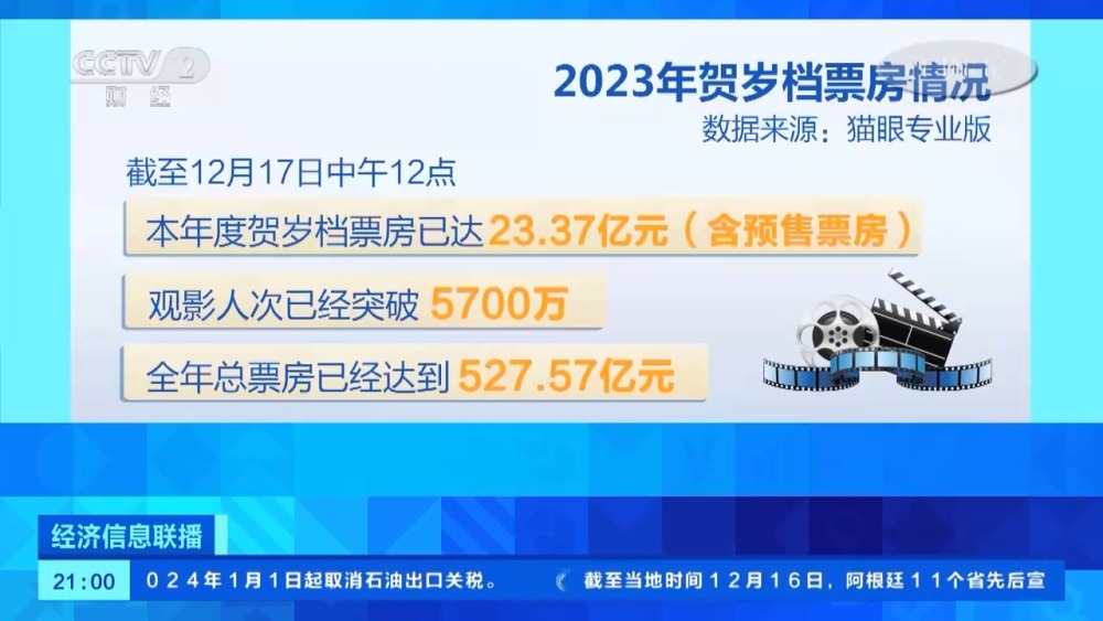 某電影數(shù)據(jù)平臺顯示,截至12月17日中午12點,本年度賀歲檔票房已達23.37億元(含預售票房),觀影人次已經(jīng)突破5700萬,全年總票房已經(jīng)達到527.57億元。