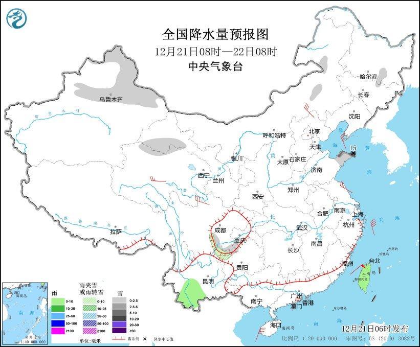 12月21日08時(shí)至22日08時(shí),新疆北部、甘肅河西、黃淮東部等地部分地區(qū)有小雪或雨夾雪,其中,山東半島等地部分地區(qū)有中到大雪,局地暴雪(10~15毫米)。云南西南部和中部、臺(tái)灣島等地部分地區(qū)有小雨。內(nèi)蒙古東南部、青海北部、江蘇中部、川西高原北部等地部分地區(qū)有4~6級(jí)風(fēng)(見(jiàn)圖3)。