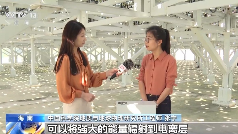中國(guó)科學(xué)院地質(zhì)與地球物理研究所工程師 張寧:通過(guò)8320個(gè)組件可以將強(qiáng)大的能量輻射到電離層,然后電離層會(huì)散射微弱的回波信號(hào)。然后我們通過(guò)低噪聲放大和波形的編解碼,可以對(duì)微弱的散射信號(hào)進(jìn)行分析,得到電離層的參數(shù),將電離層中電子和離子的狀態(tài),像顯微鏡一樣放大給科學(xué)家。