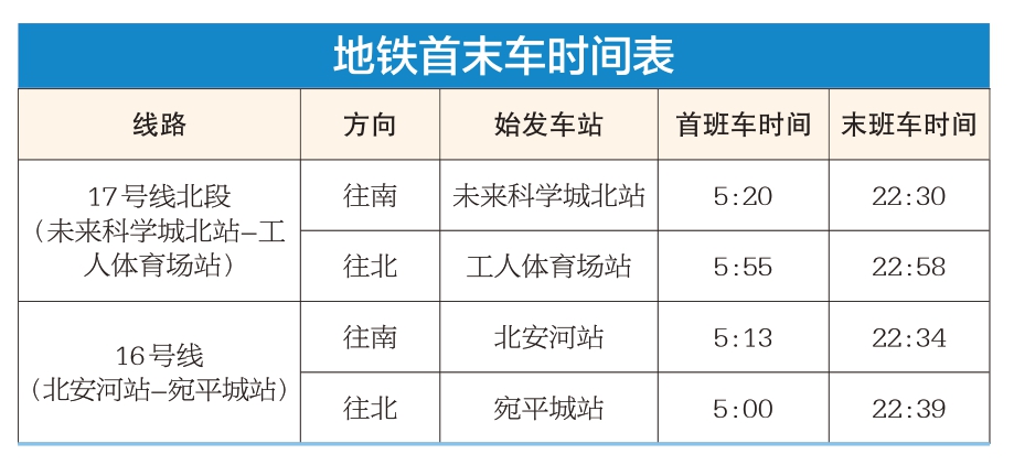今年年底,地鐵17號線北段、16號線剩余段及蘇州街站將開通。25日,京港地鐵公布17號線北段及16號線貫通后各站的首末班車時間。
