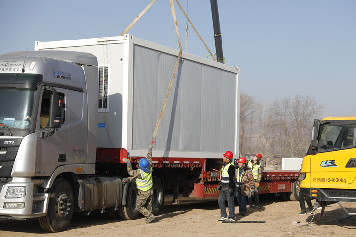 12月24日,在積石山縣劉集鄉(xiāng)陶家村一集中安置點(diǎn),施工人員在搭建活動(dòng)板房。新華社記者方欣 攝