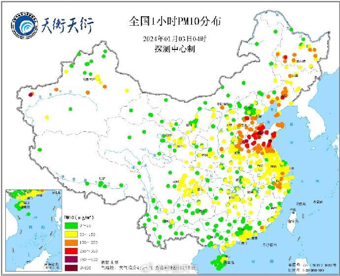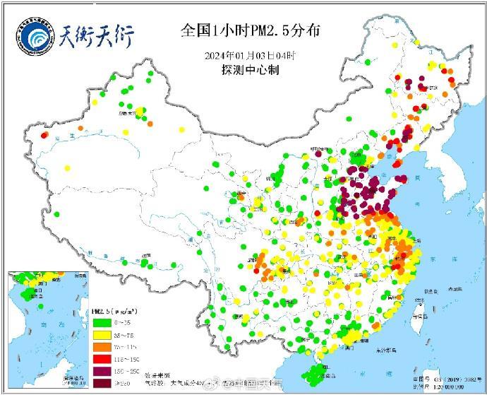 據(jù)中國氣象局氣象探測中心綜合觀測產(chǎn)品系統(tǒng)(天衡天衍)產(chǎn)品顯示,根據(jù)1月3日04時(shí)全國時(shí)均PM10、PM2.5分布圖,河北、山東、長三角、川渝等地區(qū)PM10、PM2.5濃度較高。最大PM10出現(xiàn)在山東青島站,為285微克/立方米。最大PM2.5出現(xiàn)在山東淄博站,為272.6微克/立方米。以上地區(qū)PM10大都超過150微克/立方米;PM2.5大都超過115微克/立方米。
