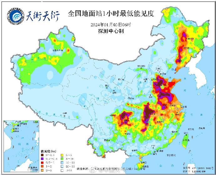 3日06時(shí),河北南部、山東、安徽、江蘇、華中、東北、四川東部、重慶等地能見度較低,局地能見度低于500米,最低能見度是24米,發(fā)生在河北臨西。