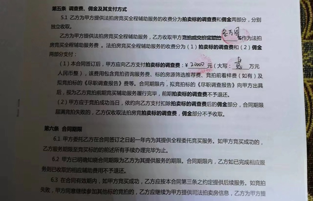 最終,中介口中30萬出頭就可以拿下的房子,被加價到了39萬,李先生放棄了競拍。他算了一筆賬,按最終成交價再加上各種費用,這套法拍房不低于同戶型的二手房價格。房子沒拍到,之前交的兩萬元“調(diào)查費”也打了水漂。在李先生給記者提供的雙方合同中,有這樣的約定:“合同期限內(nèi),擬競拍標的《盡職調(diào)查報告》向甲方出具后,視為乙方競拍前期競買輔助服務(wù)履行完畢,前期拍賣標的‘調(diào)查費’不予退還”。
