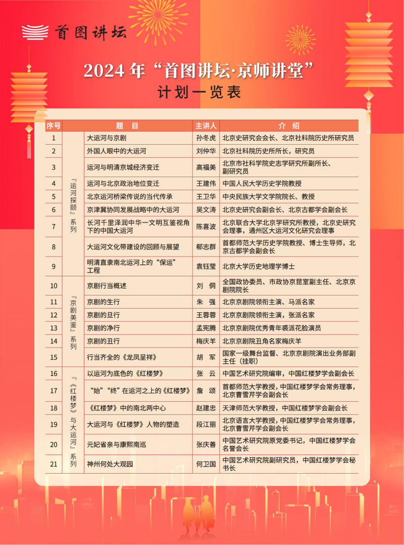 北京史研究會會長孫冬虎發(fā)布“京師講堂”2024年度主題講座計劃。全年近50場講座,包括北京胡同四合院、三山五園、明清北京商業(yè)、龍年說龍等歷史文化與社會生活主題,還有四項專題系列講座——“運河探頤”系列將以大運河的歷史變遷與運河文化的挖掘、研究、傳承為焦點,展示北京城市發(fā)展與大運河的密切關(guān)系;“京劇美鑒”系列致力于讓聽眾體味京劇國粹的獨特風(fēng)韻與文化價值;“《紅樓夢》與大運河”系列將挖掘《紅樓夢》與世界文化遺產(chǎn)大運河之間的密切關(guān)聯(lián);“清朝宮廷”系列將還原清代宮廷生活的真實場景,提升聽眾關(guān)于清代歷史與文化的準(zhǔn)確認(rèn)知。