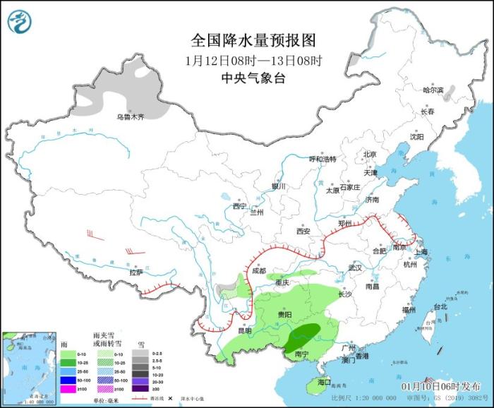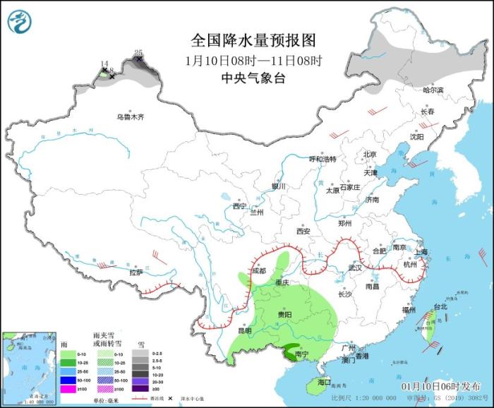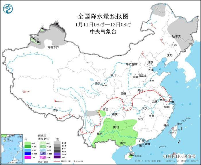 全國降水量預(yù)報(bào)圖(1月10日08時(shí)-11日08時(shí))