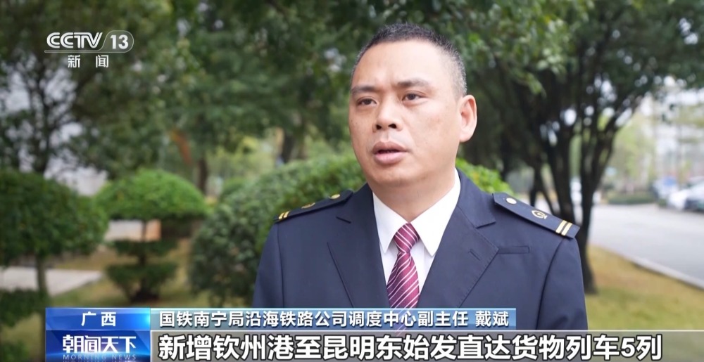 國鐵南寧局沿海鐵路公司調(diào)度中心副主任 戴斌:新增欽州港至昆明東始發(fā)直達(dá)貨物列車5列,新增防城港至德保、靖西、田東等方向貨物列車4列,不斷延伸西部陸海新通道鐵海聯(lián)運班列通達(dá)區(qū)域。