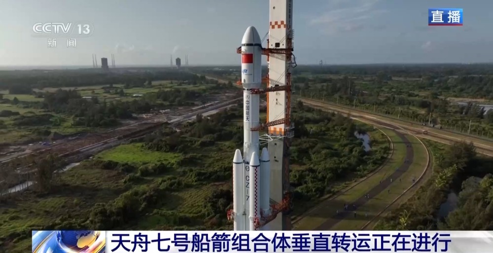 天舟七號船箭組合體垂直轉(zhuǎn)運(yùn)正在文昌航天發(fā)射場進(jìn)行