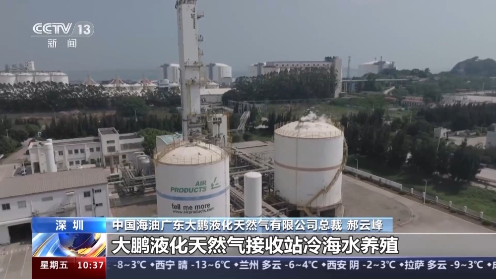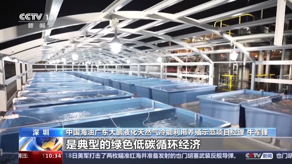 總臺(tái)央視記者 孫薊濰:我現(xiàn)在是在深圳的大鵬灣,身邊的這些藍(lán)色水箱里養(yǎng)殖著龍蝦、鮑魚等各種海鮮,養(yǎng)殖這些海產(chǎn)品的海水是廣東大鵬液化天然氣接收站的生產(chǎn)用水。