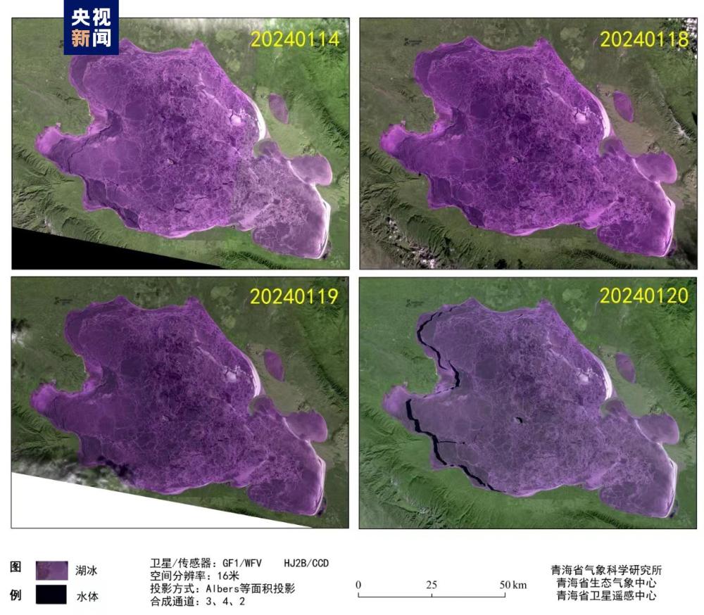記者從青海省氣象局獲悉,衛(wèi)星遙感監(jiān)測顯示,1月14日起青海湖表面完全凍結(jié),依據(jù)《高原湖泊湖冰物候遙感監(jiān)測技術(shù)標(biāo)準(zhǔn)》(DB63/T1929-2021),湖泊表面連續(xù)5日完全被冰覆蓋的首日為完全凍結(jié)日,因此判定1月14日為青海湖完全凍結(jié)日。