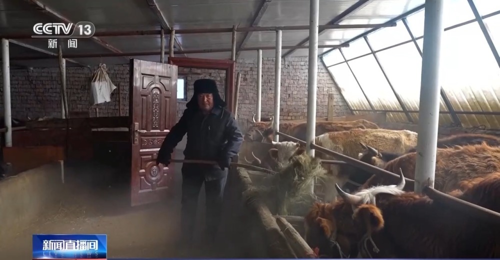 記者來(lái)到另一戶村民胡倫巴依·阿依普家的牲畜暖圈,他正在為牲畜添加草料。雖然外面寒意襲人,但暖圈里很暖和。