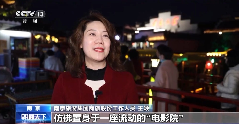 南京旅游集團商旅股份工作人員 王穎:每艘游船上都裝有GPS定位系統(tǒng),再配合沿岸的燈光、投影,讓游船在行駛途中仿佛置身于一座流動“電影院”,完整地貫通、復刻“十里秦淮”的歷史景象。