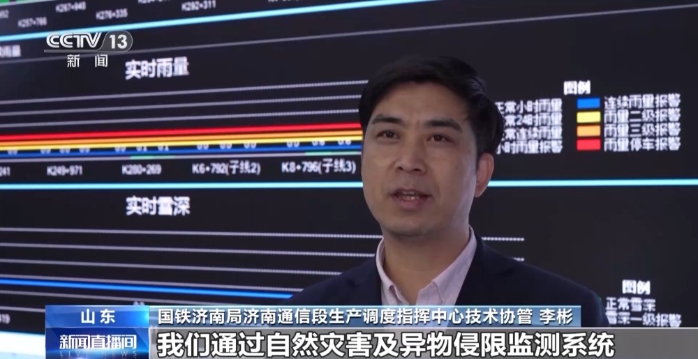 國鐵濟(jì)南局濟(jì)南通信段生產(chǎn)調(diào)度指揮中心技術(shù)協(xié)管 李彬:我們通過自然災(zāi)害及異物侵限監(jiān)測系統(tǒng),對轄區(qū)內(nèi)6000多公里鐵路線路、天氣、路況進(jìn)行分析。當(dāng)監(jiān)測點(diǎn)每小時降水量超過20毫米或瞬時風(fēng)力達(dá)到15米每秒、累計雪深超過50毫米時,系統(tǒng)會自動發(fā)出告警信息,指導(dǎo)列車限速、降速運(yùn)行。